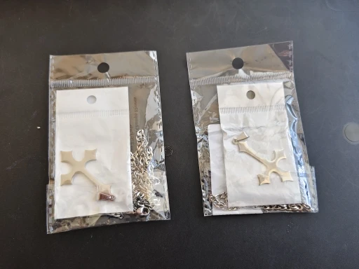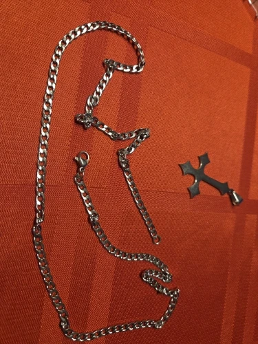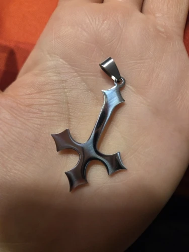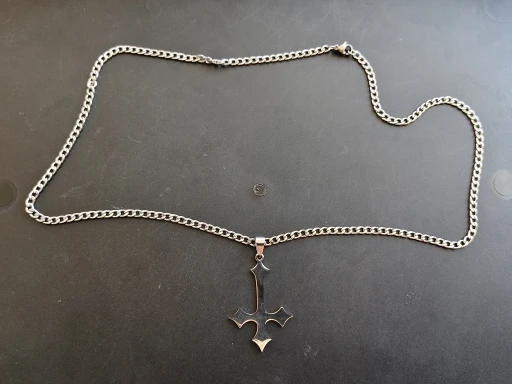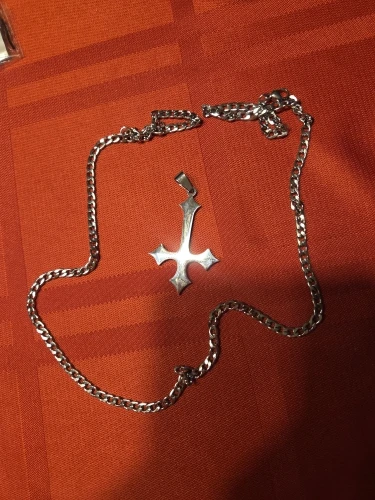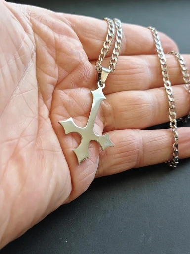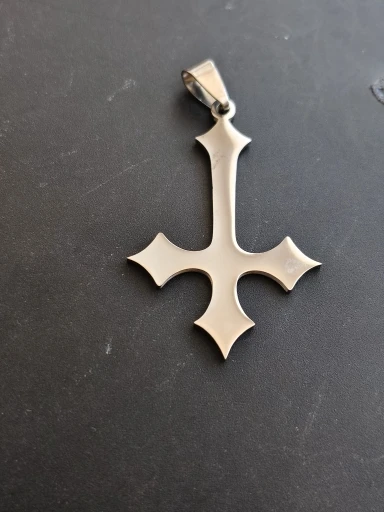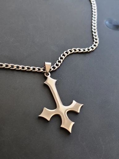 - Design: Große Halskette mit Anhänger in Form eines gotischen umgekehrten Kreuzes (auf dem Kopf stehenden Kreuzes).